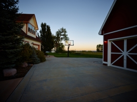 These great pictures show Murray's Pro Dunk Platinum Basketball and his barn. It is assembled by the driveway in front the barn. The dimensions of the playing area are 40' x 35'. It is located in Longmont, Colorado.